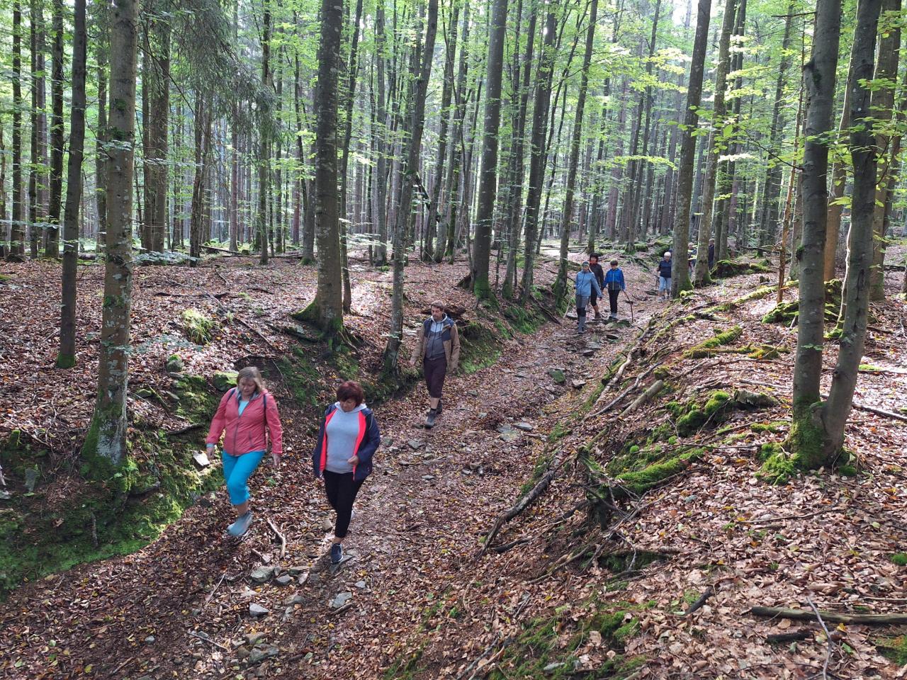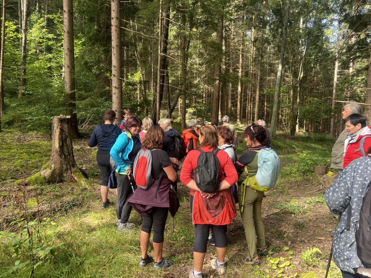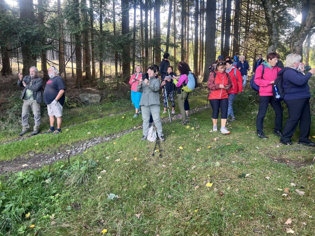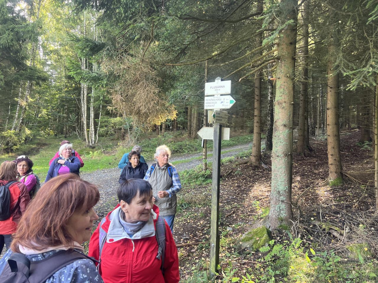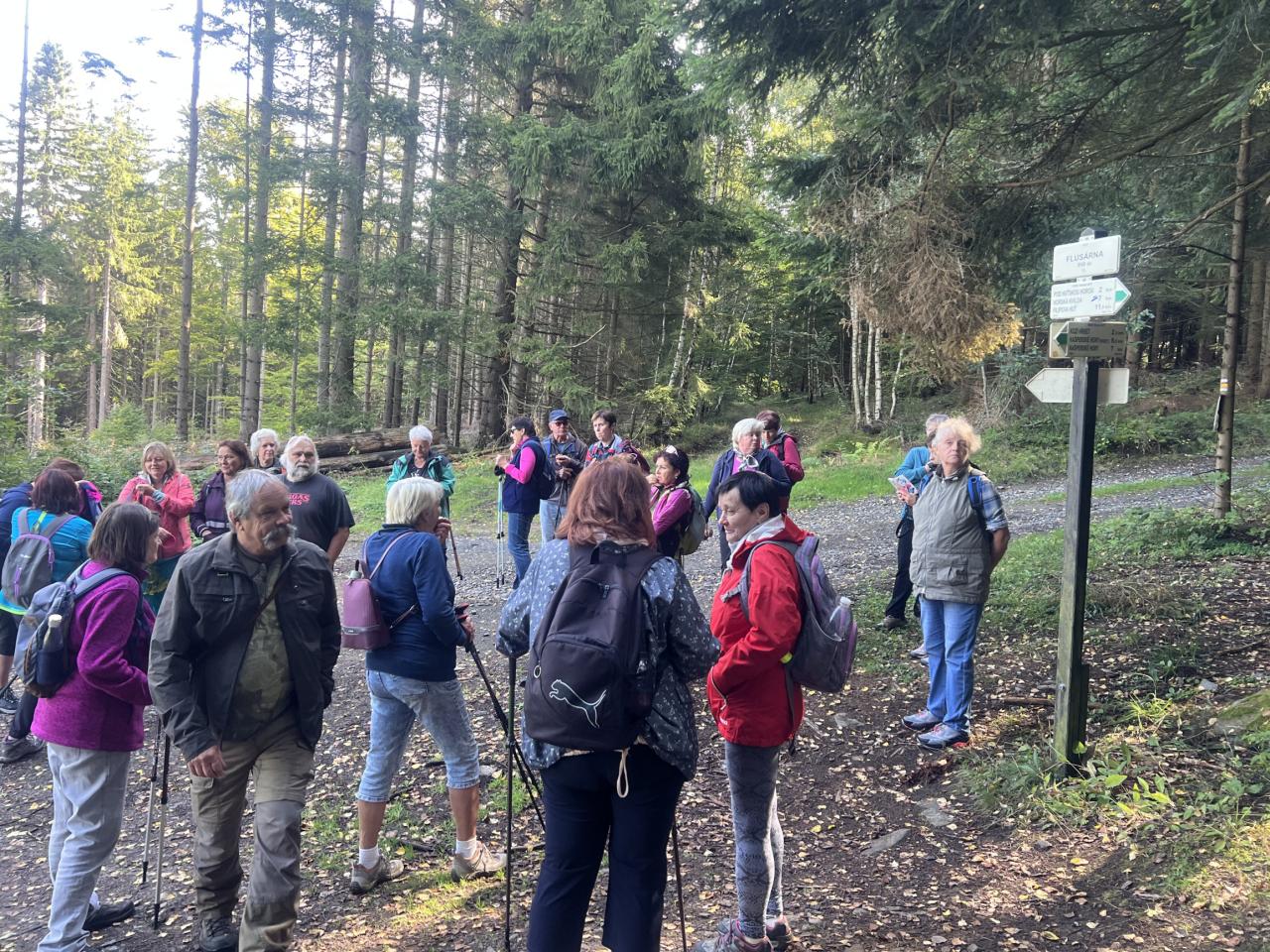 Naše putování začalo severně od obce Horská Kvilda, kousek pod vrcholem Huťské hory (1 187 m), kde kdysi stávala osada Zhůří. Nádherné výhledy na nedalekou horu Sokol, vrcholy Velkého a Malého Roklanu i Poledník. Pokračovali jsme lesní cestou k severnímu svahu Huťské hory do míst, kde stávala osada zvaná Flusárna – německy Flusshaus. Jako „flusárny“ byly označovány části skláren, kde se vyráběl „flus“ – známý také jako potaš, jedna z přísad při výrobě skla. Flus se získával loužením dřevěného popela. Z těchto míst byly opět pěkné výhledy, tentokrát mimo jiné na hrad Kašperk a pod ním město Kašperské Hory. Pokračovali jsme přes Kozí Hřbety na Maierovu skálu, nenápadný skalní útvar, který nám nabídl krásné výhledy do údolí řeky Otavy, protější Radkovský vrch i na vrch Svatobor. Odtud byl už jen kousek do městečka Rejštejna. Nástup do autobusu a přejezd na občerstvení do obce Nicov. Po dobrém obědě a zahnání žízně, nás čekal už jen odjezd domů. Počasí přálo, bylo slunečno, v lese příjemný chládek a občas i fouklo. Výšlapu zúčastnilo celkem 31 příznivců turistiky, včetně 2 dětí.