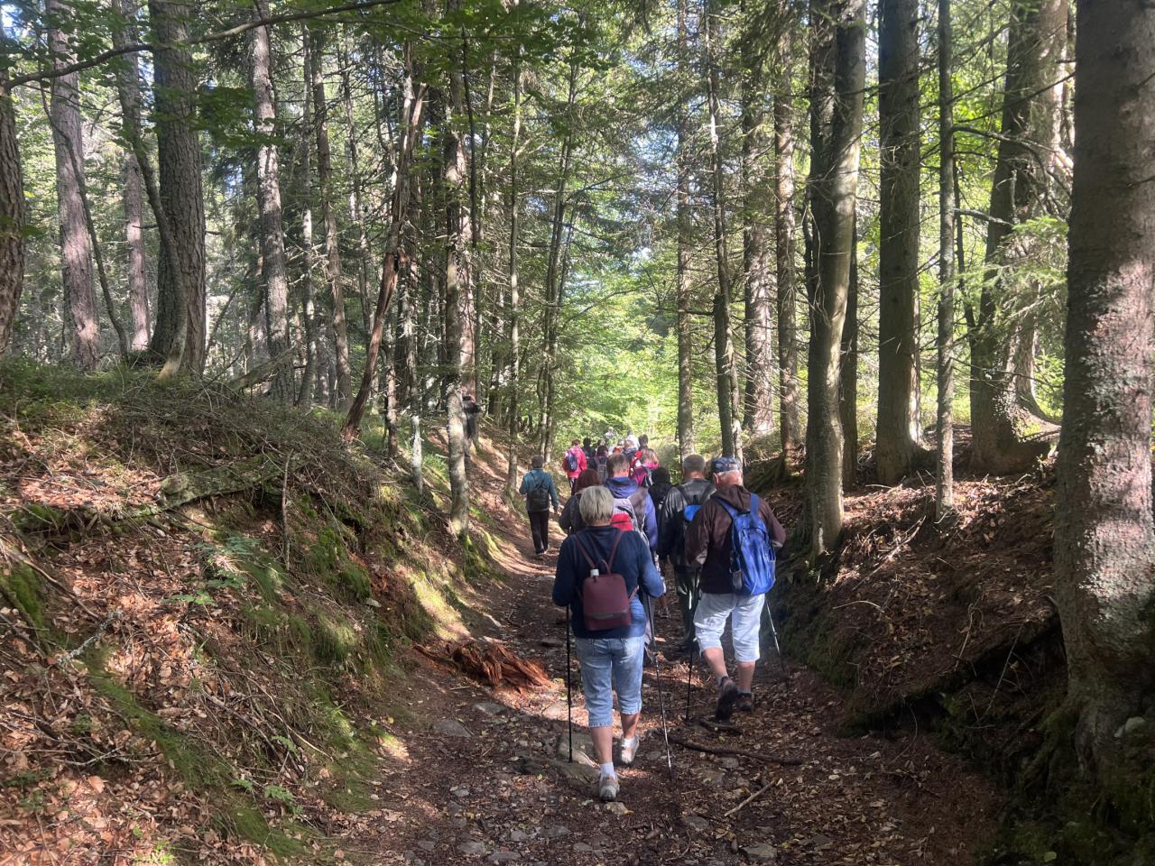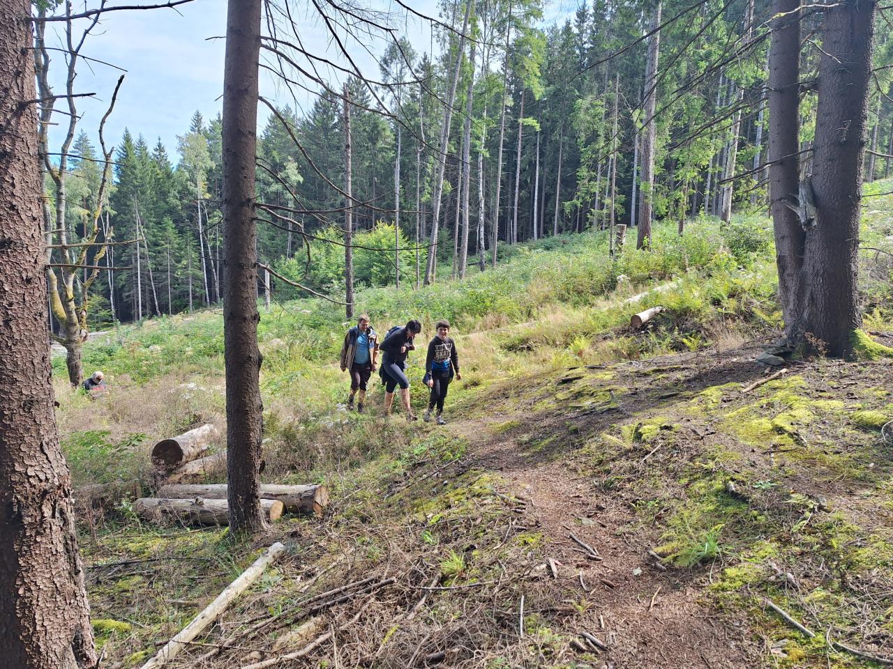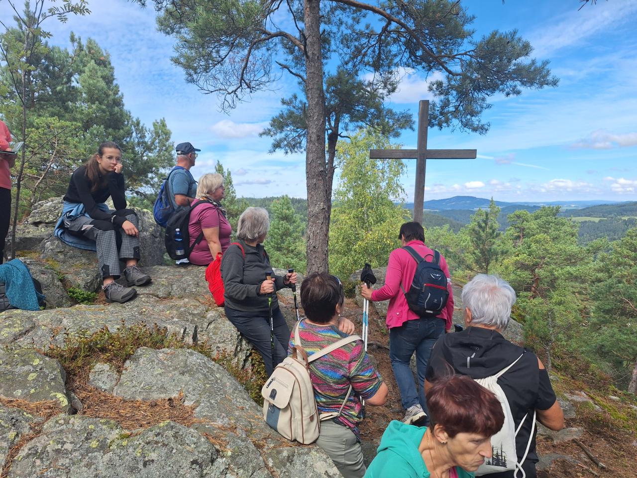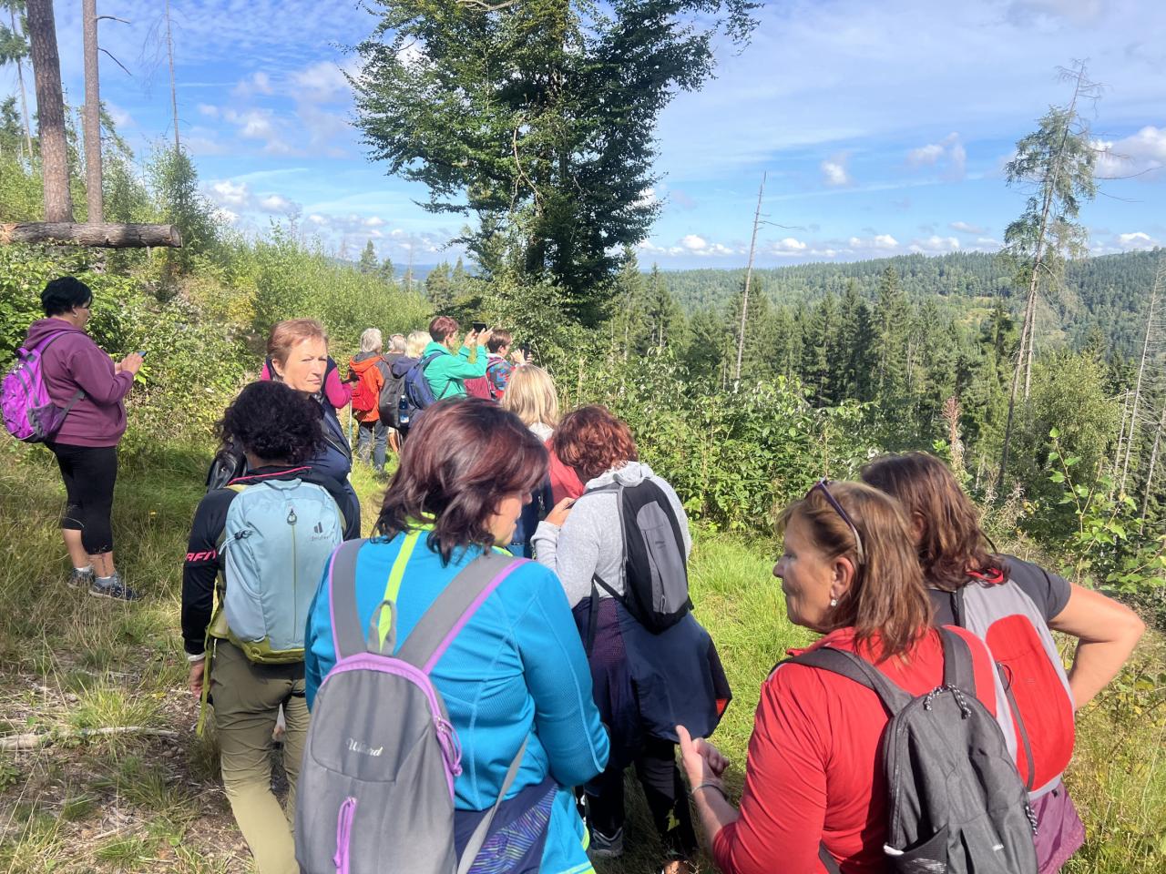 Naše putování začalo severně od obce Horská Kvilda, kousek pod vrcholem Huťské hory (1 187 m), kde kdysi stávala osada Zhůří. Nádherné výhledy na nedalekou horu Sokol, vrcholy Velkého a Malého Roklanu i Poledník. Pokračovali jsme lesní cestou k severnímu svahu Huťské hory do míst, kde stávala osada zvaná Flusárna – německy Flusshaus. Jako „flusárny“ byly označovány části skláren, kde se vyráběl „flus“ – známý také jako potaš, jedna z přísad při výrobě skla. Flus se získával loužením dřevěného popela. Z těchto míst byly opět pěkné výhledy, tentokrát mimo jiné na hrad Kašperk a pod ním město Kašperské Hory. Pokračovali jsme přes Kozí Hřbety na Maierovu skálu, nenápadný skalní útvar, který nám nabídl krásné výhledy do údolí řeky Otavy, protější Radkovský vrch i na vrch Svatobor. Odtud byl už jen kousek do městečka Rejštejna. Nástup do autobusu a přejezd na občerstvení do obce Nicov. Po dobrém obědě a zahnání žízně, nás čekal už jen odjezd domů. Počasí přálo, bylo slunečno, v lese příjemný chládek a občas i fouklo. Výšlapu zúčastnilo celkem 31 příznivců turistiky, včetně 2 dětí.