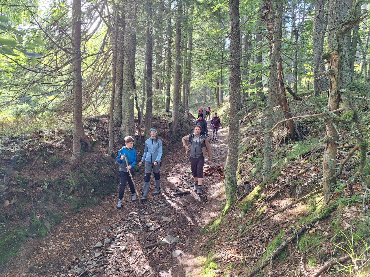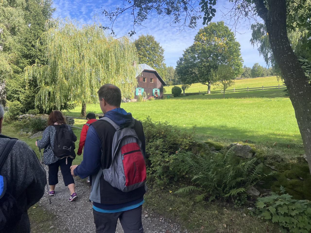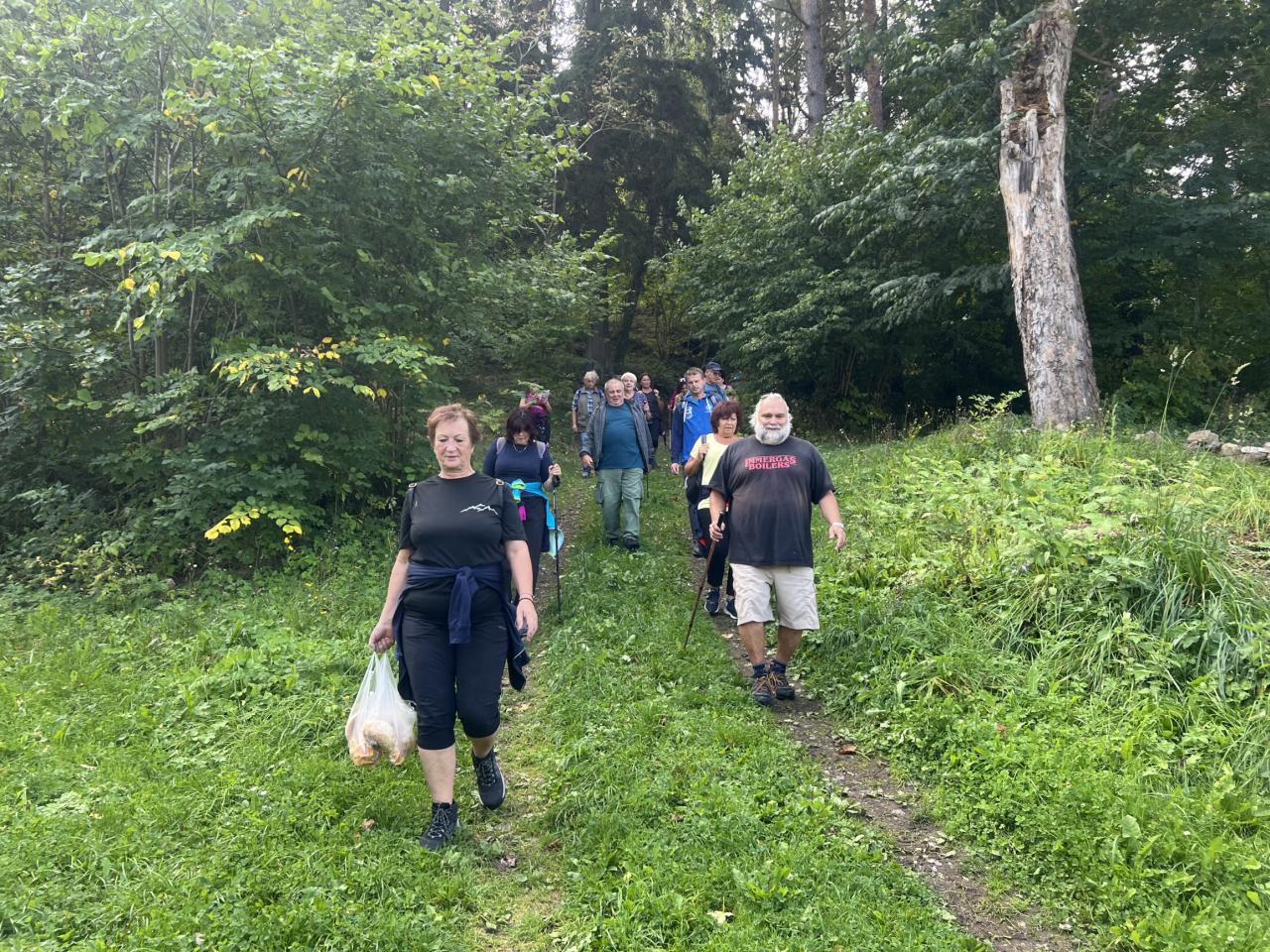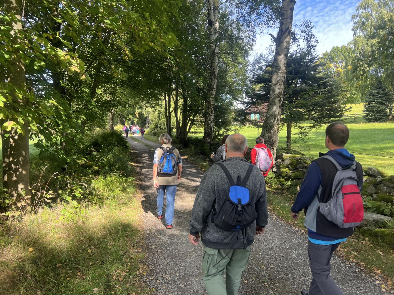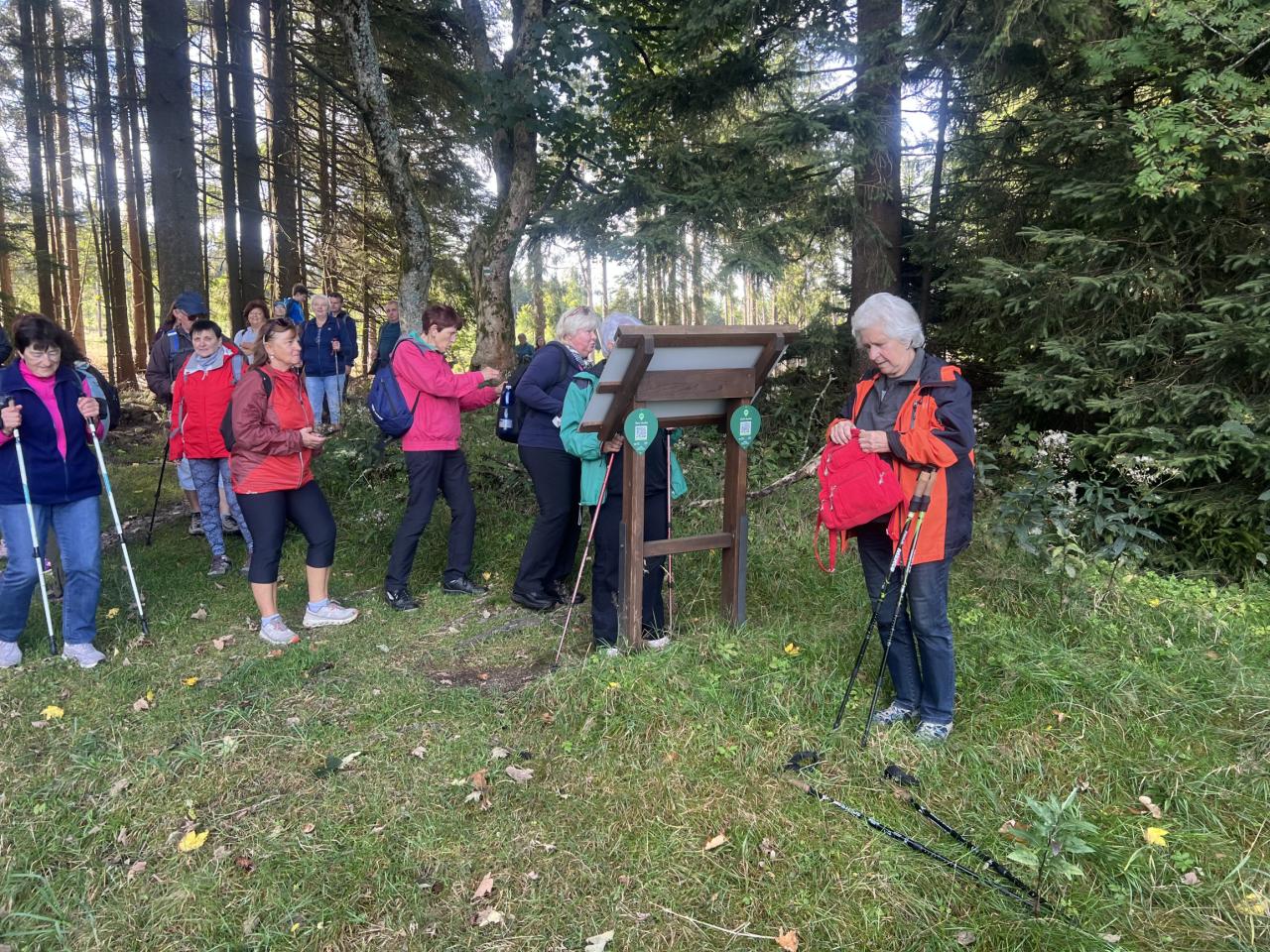 Naše putování začalo severně od obce Horská Kvilda, kousek pod vrcholem Huťské hory (1 187 m), kde kdysi stávala osada Zhůří. Nádherné výhledy na nedalekou horu Sokol, vrcholy Velkého a Malého Roklanu i Poledník. Pokračovali jsme lesní cestou k severnímu svahu Huťské hory do míst, kde stávala osada zvaná Flusárna – německy Flusshaus. Jako „flusárny“ byly označovány části skláren, kde se vyráběl „flus“ – známý také jako potaš, jedna z přísad při výrobě skla. Flus se získával loužením dřevěného popela. Z těchto míst byly opět pěkné výhledy, tentokrát mimo jiné na hrad Kašperk a pod ním město Kašperské Hory. Pokračovali jsme přes Kozí Hřbety na Maierovu skálu, nenápadný skalní útvar, který nám nabídl krásné výhledy do údolí řeky Otavy, protější Radkovský vrch i na vrch Svatobor. Odtud byl už jen kousek do městečka Rejštejna. Nástup do autobusu a přejezd na občerstvení do obce Nicov. Po dobrém obědě a zahnání žízně, nás čekal už jen odjezd domů. Počasí přálo, bylo slunečno, v lese příjemný chládek a občas i fouklo. Výšlapu zúčastnilo celkem 31 příznivců turistiky, včetně 2 dětí.