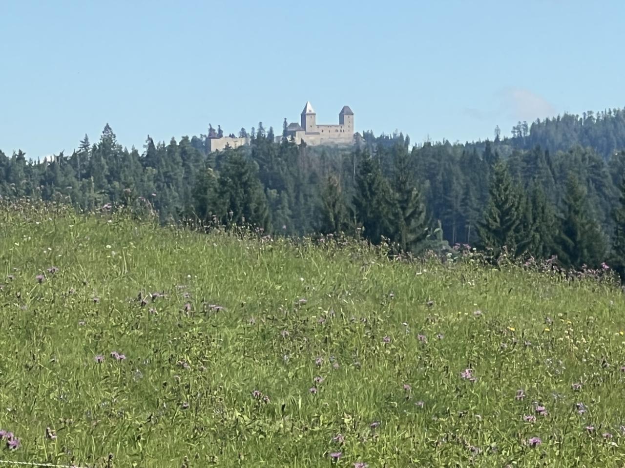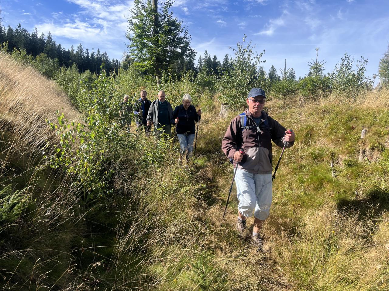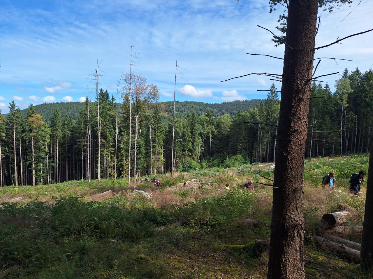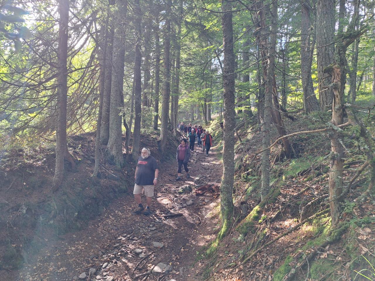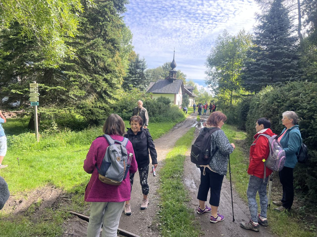 Naše putování začalo severně od obce Horská Kvilda, kousek pod vrcholem Huťské hory (1 187 m), kde kdysi stávala osada Zhůří. Nádherné výhledy na nedalekou horu Sokol, vrcholy Velkého a Malého Roklanu i Poledník. Pokračovali jsme lesní cestou k severnímu svahu Huťské hory do míst, kde stávala osada zvaná Flusárna – německy Flusshaus. Jako „flusárny“ byly označovány části skláren, kde se vyráběl „flus“ – známý také jako potaš, jedna z přísad při výrobě skla. Flus se získával loužením dřevěného popela. Z těchto míst byly opět pěkné výhledy, tentokrát mimo jiné na hrad Kašperk a pod ním město Kašperské Hory. Pokračovali jsme přes Kozí Hřbety na Maierovu skálu, nenápadný skalní útvar, který nám nabídl krásné výhledy do údolí řeky Otavy, protější Radkovský vrch i na vrch Svatobor. Odtud byl už jen kousek do městečka Rejštejna. Nástup do autobusu a přejezd na občerstvení do obce Nicov. Po dobrém obědě a zahnání žízně, nás čekal už jen odjezd domů. Počasí přálo, bylo slunečno, v lese příjemný chládek a občas i fouklo. Výšlapu zúčastnilo celkem 31 příznivců turistiky, včetně 2 dětí.